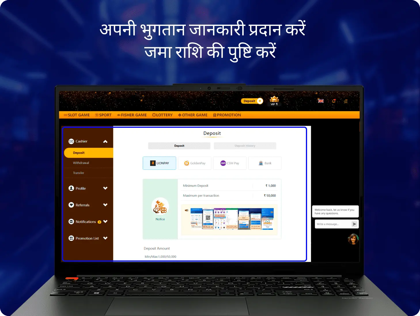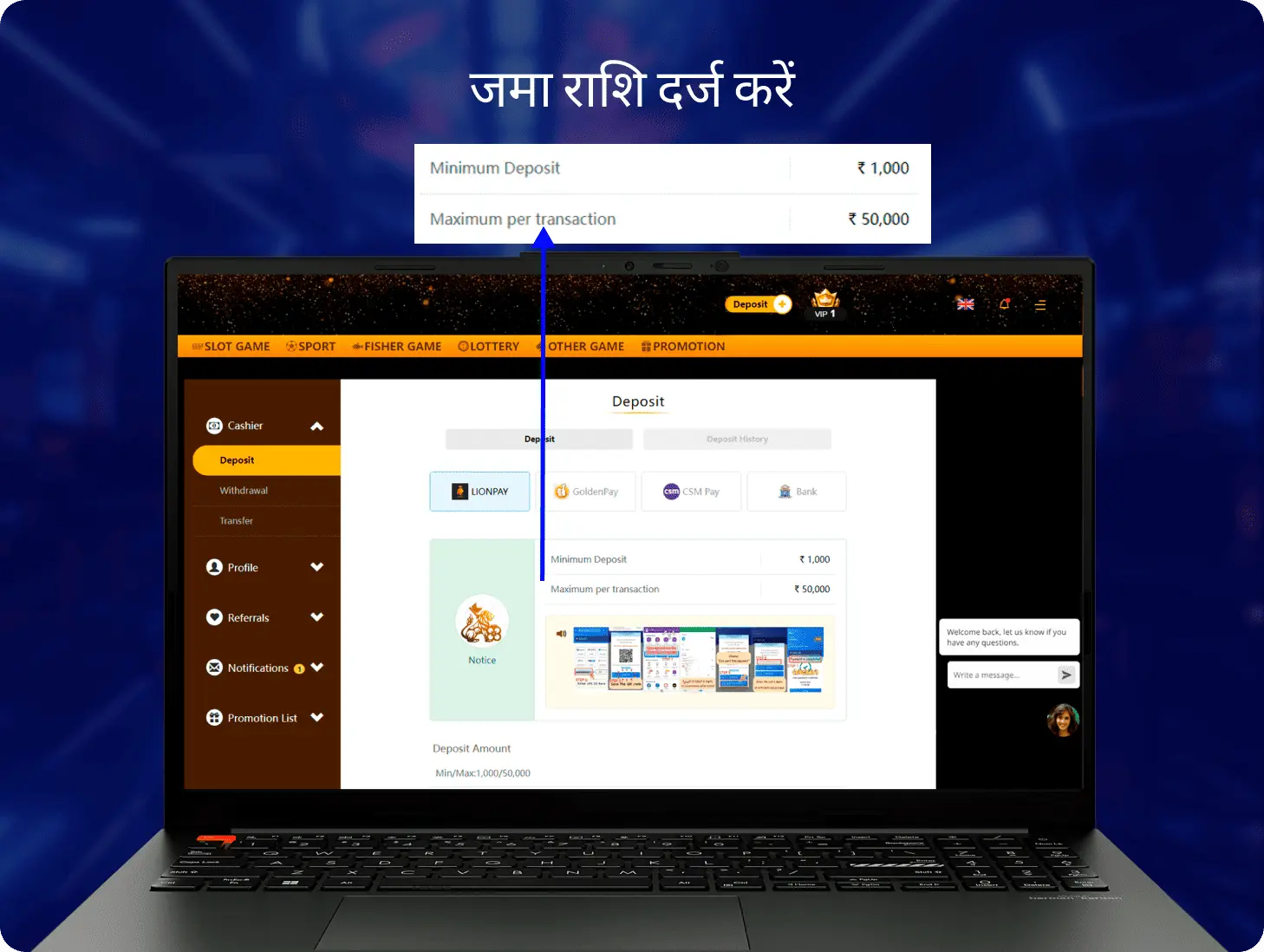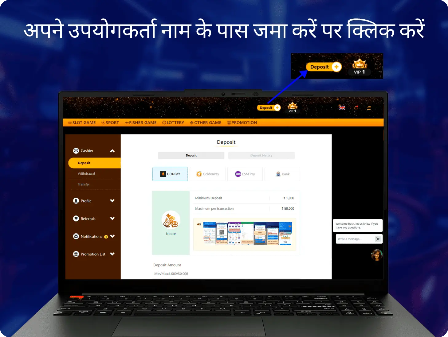 - भुगतान की पुष्टि होने के बाद, जमा राशि स्वचालित रूप से आपके खाते में जमा हो जाएगी।